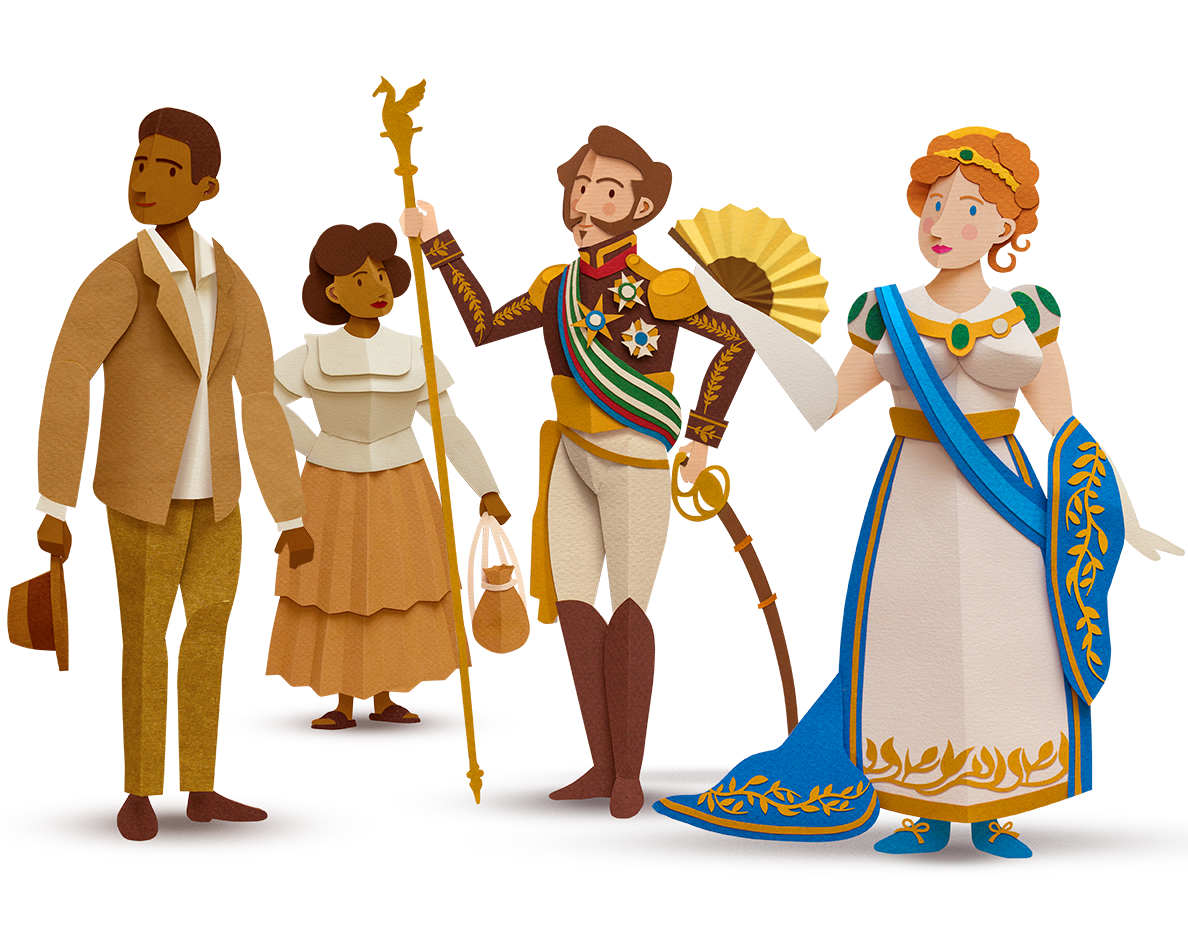 Papercraft illustrations of historical characters from colonial Brazil and their outfit.